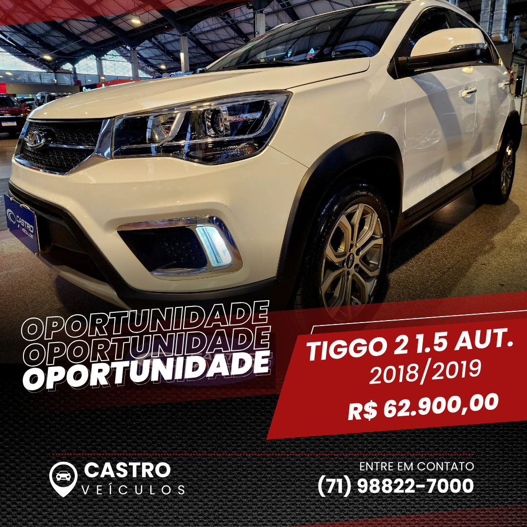 Tiggo 2 Look 1.5 Automático 2018/2019 Novíssimo CASTRO VEÍCULOS. VENDAS: (71) 98233-7534 Tiggo 2 Look 1.5 Automático 2018/2019 Novíssimo Preço: R$ 62.900,00 Combustível: Gasolina e álcool Câmbio: Automático Cor: Branco KM: 59.000 OPCIONAIS: Direção hidráulica Desembaçador traseiro Computador de bordo Banco do motorista com ajuste de altura Ar-condicionado Air Bag Encosto de cabeça traseiro Freio ABS Rodas de liga leve Sensor de estacionamento Travas elétricas Vidros elétricos Volante com regulagem de altura (71) 98822-7000 (WhatsApp) 1ª Travessa Luiz Tarquínio Pontes 223 CEP 42.702-430 - Centro, Lauro de Freitas – BA
